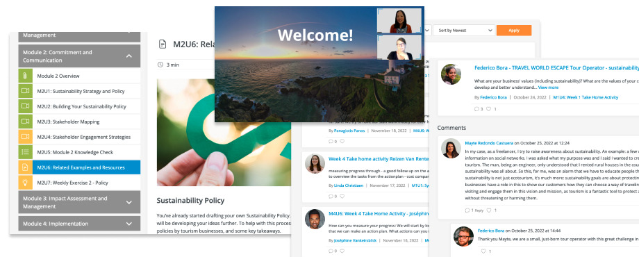 All about the FLOW Offering a flexible learning environment, the online facilitated courses combine the convenience of virtual learning with the benefits of interactive people-focused learning to optimize results for busy professionals. The key ingredients of this approach is represented in its name, which stands for: Facilitated: We firmly believe that learning is about the learners, and their individual journeys. That's why, an effective course is not just about giving good content, but also about facilitating the learning processes. Learner driven: Just as important as the technical knowledge of our expert trainers, the inputs by the learners form a core of our courses, reflecting their backgrounds, perspectives and experiences. Outcome oriented: Always keeping in mind that “teaching without learning is just talking” (Angelo TA and Cross KP), we design learning experiences that focus on what the learners can achieve and how that will support their goals, rather than focusing just on what they receive. Welcoming: Our courses are people-focused, because we know personal connections support learning outcomes. We create a welcoming and safe space for all learners to engage in discussions with each other to make the most of their learning experience. How does it work? Our online courses are designed to support the skills-building needs of busy tourism professionals. Practical lessons and guidance by expert trainers and contributors. Hands-on activities to help you apply your knowledge to your specific real-life, on-the-job practices; and Live and interactive components to enhance learning results through sharing ideas and collaborating with each other. Throughout the process, our Course Facilitator will guide you along the way, and you will receive email updates with useful information and to help you keep track of your progress. Will it work for me? Our online courses are a dynamic and interactive way to learn from anywhere in the world, and are a good fit for you if: You like the convenience of learning at your own pace, setting your own schedule for watching video lessons and working on assignments. But you also like to have some structure and guidance to help you stay motivated and to make it easy to stay on track. And you want your online learning experience to be flexible, but at the same time as interactive and engaging as possible. Main components Self-study content: Weekly video lessons, reading materials and related resources that you can go through at your own pace and re-visit any time during the course. Live interactive sessions: Live presentations and discussions for real-time lessons.Scheduled webinar sessions featuring live discussions, breakout groups and guest expert presentations. You will have the opportunity to connect with your trainers, guest experts and fellow learners. Collaborative activities: Group activities designed to enhance learning results through sharing ideas and collaborating with each other. These activities and exercises will help you turn your knowledge into action. Ongoing discussions: Discussion forums are available throughout the course for sharing examples, posting questions, and exchanging ideas with each other. Professional networking In addition to knowledge-sharing, our courses help facilitate community-building opportunities. Networking with like-minded professionals is a critical aspect of a valuable and lasting part of your professional development. That's why we design our courses intentionally to optimise opportunities for our learners to connect with and learn from a diverse group of tourism industry colleagues and sustainability leaders from around the world. Questions? Want to learn more? Please feel free to contact us, we're here to help!