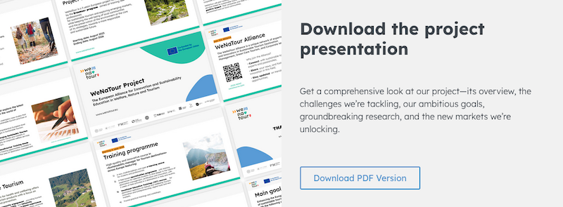 WeNaTour Project: Sustainable Tourism, Nature and Well Being for Tourism Destinations WeNaTour is a European project funded by the Erasmus+ program aimed at training new professionals for sustainable tourism and exploring emerging markets, while keeping the well-being of local communities and the preservation of the environment at the core of its strategies, towards a more responsible and sustainable future. TrainingAid Expert Team at TrainingAid Published: September 23, 2024 ProjectsDestination ManagementCertification and StandardsTourism Skills and Jobs AREA Consultation on Online Capacity Building Solutions PARTNER University of Padua (UNIPD) PROJECT ERASMUS-EDU-2022-PI-ALL-INNO WHEN 2022 - 2025 WeNaTour is a three year European initiative funded through the Erasmus+ program. It involves 12 partners from 5 countries. The program is aimed at training new professionals for sustainable tourism and exploring emerging markets, while keeping the well-being of local communities and the preservation of the environment at the core of its strategies, towards a more responsible and sustainable future. Thematic sectors Sustainable Tourism Nature for Health and Wellbeing Education and Innovation Company Welfare TraininngAid provides technical support in areas such as training program development, course content design, and training material quality management. Our work in learning design and capacity building applies approaches based on the sustainability principles, including participatory and collaborative stakeholder engagement processes. Learn more about WeNaTour WeNaTour Project: The European Alliance for Innovation and Sustainability Education in Welfare, Nature and Tourism Enhancing the European educational offer in the field of sustainable tourism and destination management through: New resources: Researching trends and needs with case studies, reports, market outlooks, training needs assessments. Training: An online training course for students and professionals; A field-based specialization school for selected students; and Vocational Education Trainings (VET). Corporate Social Responsibility and Company Welfare opportunities: Increasing the positive impact of companies and employees on the environment and local communities. ProjectsDestination ManagementCertification and StandardsTourism Skills and Jobs Share this