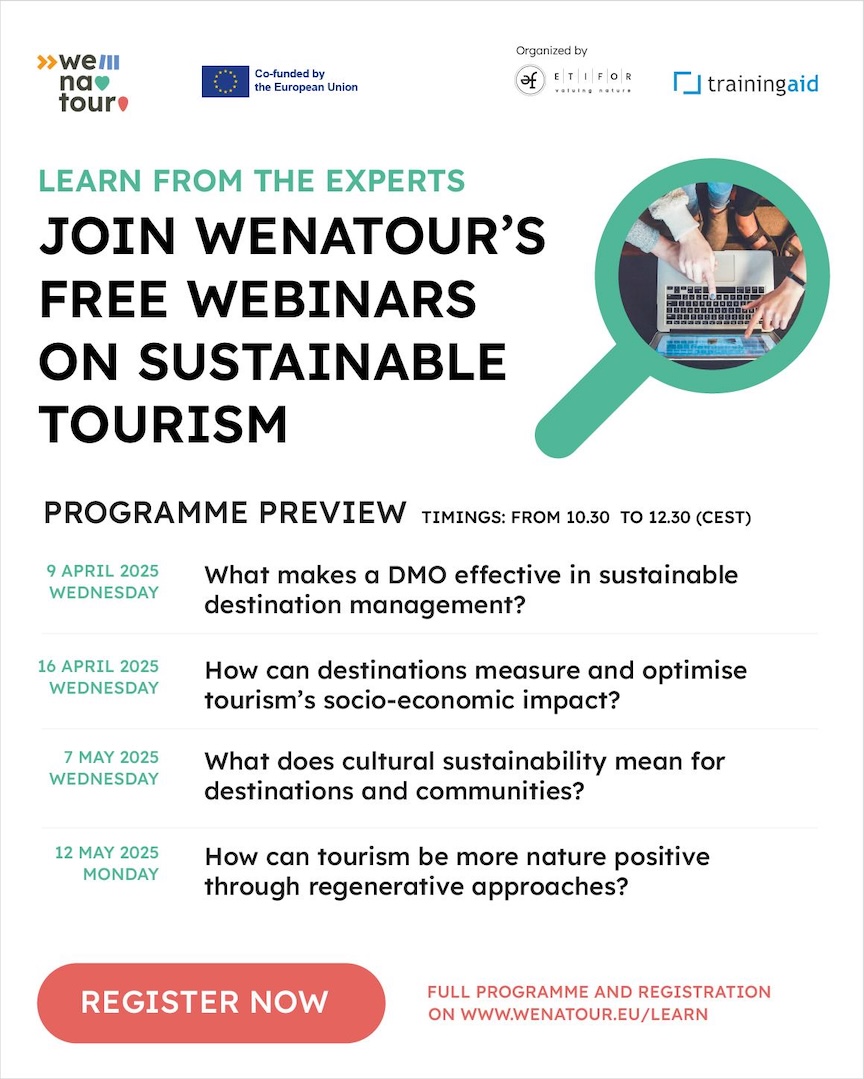 What Makes a DMO Effective in Sustainable Destination Management? Join our first webinar to explore Destination Management Organizations (DMOs), their structure, and key responsibilities. Learn best practices for sustainable management, stakeholder collaboration, and destination stewardship through real-world examples. TrainingAid Expert Team at TrainingAid Published: March 18, 2025 TrainingAid NewsDestination StewardshipDestination Management Date: Wed, 9 Apr 2025 Time: 10:30 - 12:30 CEST Location: Online Webinar WeNaTour Project: Sustainable Tourism Destination Management Webinar Series (1/4) > Register now to secure your spot! Our first webinar will explore the structure and responsibilities of Destination Management Organizations (DMOs), highlighting their critical role in sustainable tourism management. As the tourism industry evolves, DMOs must balance economic, environmental, and social impacts while fostering responsible growth. This session will introduce key concepts, methodologies, and best practices for sustainable destination management and stakeholder collaboration, offering real-world insights to help navigate the complexities of destination stewardship. This webinar is part of a 4-part webinar series open to the public. Why You Should Attend This exclusive webinar is designed for tourism professionals, government officials, business owners, and anyone passionate about sustainable tourism. By attending, you will: ✔ Gain insights into how DMOs shape responsible tourism development. ✔ Learn best practices for stakeholder collaboration and destination stewardship. ✔ Discover real-world case studies that highlight successful sustainability strategies. ✔ Engage with industry experts and network with like-minded professionals. Speakers Ayako Ezaki, TrainingAid (moderator) Alessia Fiorentino, Etifor | Valuing Nature Riccardo Da Re, Etifor | Valuing Nature Michele Oriente, ApT Valsugana Lagorai Reserve Your Spot Today! Don’t miss this opportunity to learn from industry leaders and take actionable steps toward more sustainable destination management. > Register now to secure your spot! Once registered, you will receive two emails:Confirmation email – immediately after registration.Reminder email – sent shortly before the webinar as a prompt. We recommend checking your spam folder if you do not receive these emails. The link to the Zoom live event will be sent some days after the registration. This webinar is part of a 4-part webinar series Webinar 1: What Makes a DMO Effective in Sustainable Destination Management? (April 9th, 2025) Webinar 2: How can destinations measure and optimise tourism’s socio-economic impact (April 26th, 2025) Webinar 3: What does cultural sustainability mean for destinations and communities? (May 7th, 2025) Webinar 4: How can tourism be more nature positive through regenerative approaches? (May, 12th 2025) About WeNaTour WeNaTour is a three-year European initiative, funded by the Erasmus+ program, designed to train the next generation of sustainable tourism professionals. Through cutting-edge insights, best practices, and expert-led discussions, our program prepares individuals to drive positive change in tourism destinations worldwide. To give you a taste of the WeNaTour experience, we are opening up a 4-part webinar series to the public. This is a unique opportunity to gain valuable knowledge, connect with industry experts, and explore if the WeNaTour Sustainable Tourism Course is right for you! For more info visit https://wenatour.eu/learn TrainingAid NewsDestination StewardshipDestination Management Share this